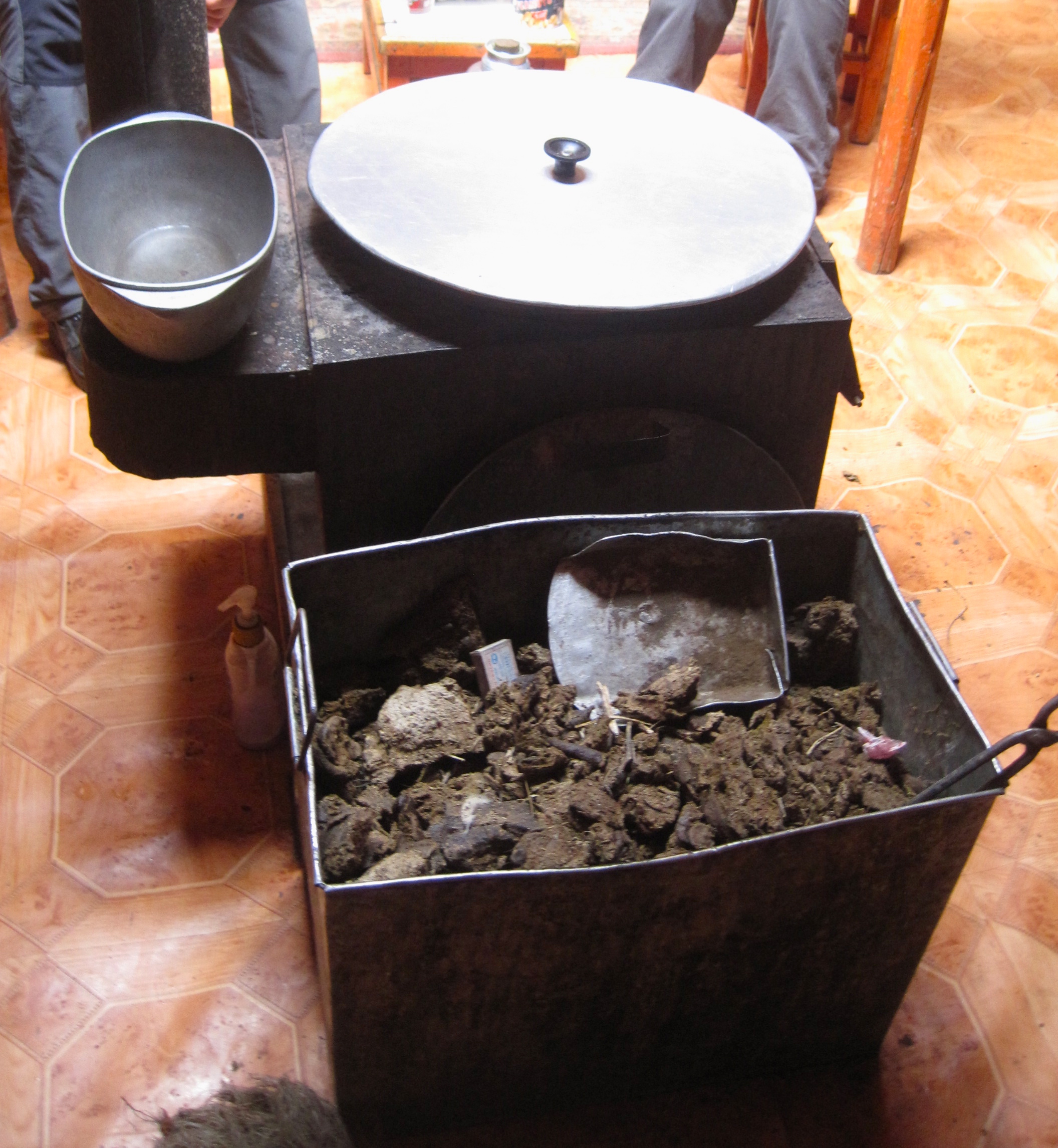 Everything gets cooked on this stove in big bowls that dip into the fire (one is covered here now). The stove also is the yurt’s central heating. It is most commonly powered by dried animal dung, like that in the box next to it.